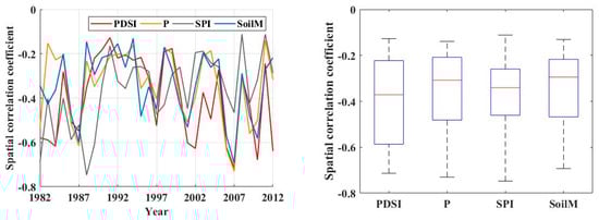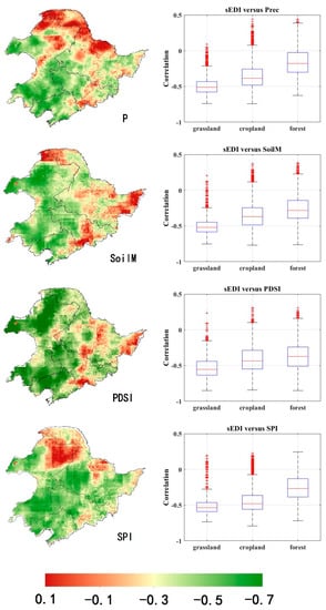 To assess the similarity among indicators in their ability to rank drought severity, we firstly examined the temporal correlation between annual sEDI and other relevant indices during 1982–2012, which can be seen from Figure 10. Using the time series of different data, the linear correlation was calculated for every point across the Northeast China. Plots of correlations with SoilM and P indicate that sEDI effectively integrates moisture conditions and precipitation over grassland and cropland of Northeast China. However, for forest areas, sEDI is more related to SoilM than P.