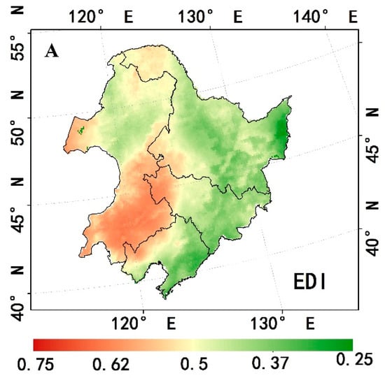3.2.1. Mean Spatial Pattern of EDI in Northeast China