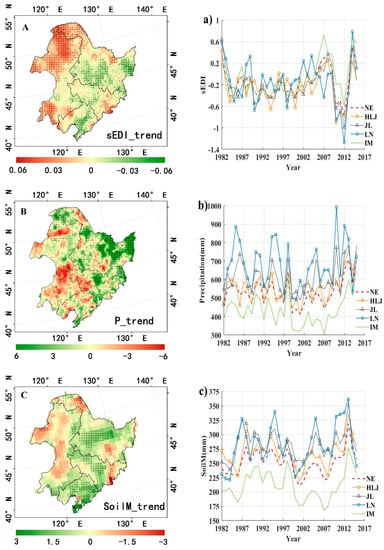 Figure 13A presents the spatial distribution of sEDI trends over Northeast China from 1982 to 2015. Our results illustrate that 56.5% of areas of Northeast China became drier during 1982–2015 and 29.6% of areas show a significant increasing trend of sEDI (p < 0.05). Increased drought has mainly occurred in Inner Mongolia, except for the middle part of this province. As shown in Figure 13a, Inner Mongolia had experienced a continuously increasing drought before 2007 and the severity of drought reach its maximum in 2007, which is consistent with the finding of Liu et al. []. Although the drought episodes deceased in the period of 2007–2012, serious drought conditions occurred again over Inner Mongolia after 2012. In comparison with the trend of P and SoilM (Figure 13B,C), we find that in the northwest regions of Inner Mongolia, namely Hulun Buir Grassland, drier climate and the grassland destruction caused the increased drought []. For the north part of Da Hinggan Mountains located at northern Inner Mongolia and northern Heilongjiang, although few portions received more precipitation, the uneven distribution of precipitation and increasing water consumption contributed to the positive trend of drought. Moreover, southern Inner Mongolia and eastern Jilin were affected by a drying trend, coinciding with decreasing rainfall and decreasing soil moisture, respectively.