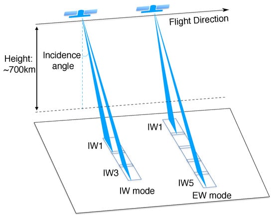 Besides, the new generation of SAR satellites can operate Terrain Observation by Progressive Scans (TOPS) acquisition mode, such as Sentinel-1 and TerraSAR-X. TOPS employs a rotation of the antenna in both the along track and cross track directions. Consequently, the incidence angle varies in a relatively large range when compared with using conventional stripmap mode. Figure 2 shows the Interferometric Wide Swath (IW) and Extra Wide Swath (EW) modes of Sentinel-1, which are implemented as three and five subswaths TOPS SAR modes. The incidence angle range for IW and EW is 29.1–46.0 and 18.9–47.0, respectively []. Hence, atmospheric heterogeneity along the zenithal and LOS direction occurs with high probability in such a big incidence angle. Consequently, the projection of ZTD to LOS delays is not a reliable approach.
