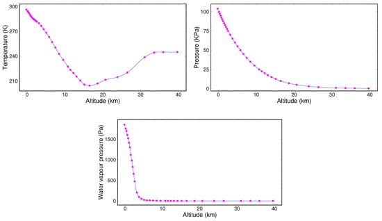 Although ECMWF provides 37 pressure levels reanalysis data higher than 40 km above the sea level, in practice beyond a certain elevation, the parameters can be considered constant. A cubic spline interpolation was applied on grid points from sea level to a reference elevation for the temperature, the pressure, and the relative humidity along the vertical direction. Figure 5 visualizes the vertical interpolation results for different parameters at Grid Point A (see Figure 4a). It is clear that the curves for all parameters were smooth, with no abrupt changes, and so, the cubic spline interpolation was adequate. The interpolation results at Point A represent a general situation of the low-pass behavior of the parameters. The interpolated data along the vertical direction will further provide input data for the horizontal interpolation on the desired locations along the LOS direction.