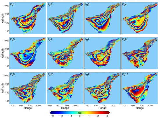Original wrapped differential interferograms covering one entire year over Tenerife island, Spain. Each interferogram connects two consecutive months. Detailed temporal and spatial baselines information for each interferogram can be found in Table 1.