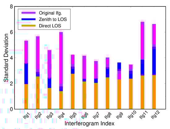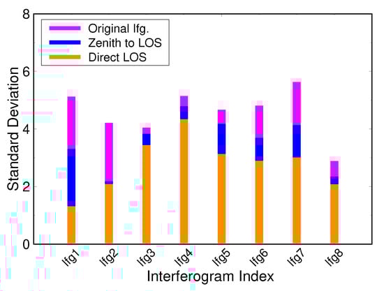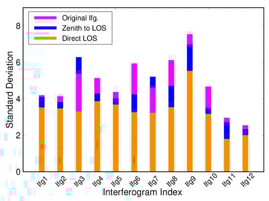 Both methods were applied to all the interferograms, and the performance results are listed in Table 3 and graphically illustrated in Figure 14. It is clear from Figure 14 that, for most interferograms, the Z-LOS mitigation reduced the tropospheric delays, except for Ifg3 and Ifg7. For these two cases, the SD values actually increased. After correcting with the D-LOS method, all interferograms showed an obvious SD reduction. Overall, compared with the average 14% mitigation achieved by the Z-LOS method, the D-LOS algorithm was able to achieve a 29% reduction on average.