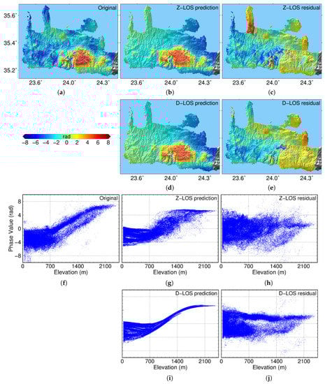 With the Z-LOS method, this feature can be partly estimated (Figure 11b), and so, the dominant trend can be removed with the correction, as can be seen in Figure 11c. However, paying attention to certain areas, the Z-LOS method over-predicted the tropospheric delay locally. The scatter plots of Z-LOS predicted and corrected phases shown in Figure 11g and Figure 11h further proved this. From these plots, it is clear that the Z-LOS predicted phase delay showed a large variance, producing relatively large fluctuations in the residual phases. Statistically, the phase SD was reduced by 19% from 2.88 to 2.34 rad. With the D-LOS algorithm, the patterns of predicted APS in Figure 11d showed a good correspondence with the original interferogram, both in location, as well as amplitude. The D-LOS corrected interferogram (Figure 11e) showed relatively small phase values, fluctuating around zero. The observed D-LOS phase-elevation pattern shown in Figure 11i matched the features of the original interferogram. Additionally, it is important to highlight the smaller variance in the residual phase compared with the Z-LOS one. The good correspondence between the original interferogram and D-LOS prediction was also confirmed by a significant SD reduction in the phase residues, by 28% from 2.88 to 2.07 rad.