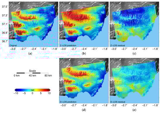 The time difference between ERA5 and Sentinel-1 acquisition was less than 10 min in this case. Again, it can be assumed that the atmospheric conditions would be very similar in such a short time difference. Figure 13a shows how the differential interferometric phase due to the atmospheric artifacts was strongly correlated with the topography. The Z-LOS predicted phase, shown in Figure 13b, was able to retrieve partially the trend of the original interferogram, especially in the flat areas, but it failed in some of the mountainous locales. The bad performance of the estimated APS was better highlighted with the residual phases shown in Figure 13c. The phase SD was reduced only by 8%, from 2.54 to 2.33 rad, with the Z-LOS correction. A significant improvement in the performance can be observed with the D-LOS approach. Specifically, the D-LOS prediction shown in Figure 13d exhibited a very similar phase pattern with the original one in terms of the shape and amplitude. As Figure 13e shows, the tropospheric delays all over the interferogram were reduced except in some localized areas located near the top of some mountains. With the D-LOS method, the phase SD was reduced by 39% to 1.79 rad.