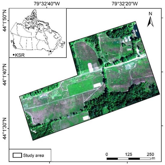 This research was performed at Koffler Scientific Reserve (KSR), located in Southern Ontario, Canada (Figure 1). Grasslands in KSR mainly consist of temperate tall grasses with a height ranging from 10 to 50 cm during the growing season (May to September) []. Dominant grass species in this area are Awnless brome (Bromus inermis), Fescue (Festuca rubra L.), Goldenrod (Solidago canadensis L.), and Milkweed (Asclepias L.). The climate type in this area is temperate continental, with a mean temperature ranging from −10 °C (February) to 30 °C (July), and precipitation ranging from 20 mm (March) to 100 mm (July) []. The soil in this area is typically grey-brown podzolic soil.