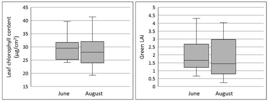 Field surveys were performed simultaneously with the flight missions. A total of 29 study sites were pre-selected in the study area for the field survey in June. The selection of sites was dependent on vegetation growing conditions, species composition, and topographic conditions. An extra five study sites were added for the field survey in August due to the increased variety of vegetation canopy features. The location of each site was obtained using a highly accurate Trimble GeoExplorer GPS (Trimble Navigation Limited, Sunnyvale, CA, USA). Field data collected at the study sites included spectral reflectance, LAI, vegetation height, species composition, and canopy photos. The spectral reflectance data were collected using an ASD spectroradiometer FieldSpec 3 in the range of 350–2500 nm (Analytical Spectral Devices Inc., Boulder, CO, USA). LAI was measured using an AccuPAR LP-80 ceptometer (Decagon Devices, Inc., Pullman, Washington, WA, USA). Leaf samples for each site were also collected and transported to a laboratory for measuring leaf reflectance and chlorophyll content. Leaf reflectance was acquired using Plant Probe (Analytical Spectral Devices, Inc., Boulder, CO, USA) that was connected to the ASD FieldSpec spectroradiometer, following the protocol provided by [] and []. The measured reflectance data were used for evaluating the simulation results from radiative transfer models. Leaf chlorophyll was extracted using N, N-dimethylformamide (DMF) following a protocol proposed by []. Canopy chlorophyll content was then calculated using leaf chlorophyll content times LAI of green vegetation (i.e., green LAI) [,,,,]. For the survey in June, the green LAI equals to the field-measured canopy LAI since the canopies were homogeneous green vegetation. For the survey in August, the canopies were heterogeneous with mixed green and senescent vegetation. The green LAI was calculated using field-measured canopy LAI times the percentage of green vegetation in this canopy. This percentage (e.g., 20%, 55%, or 100%) was manually estimated in the field using a quadrat (0.5 × 0.5 m). Statistics of measured leaf chlorophyll content and green LAI is shown in Figure 3. Correlations between canopy chlorophyll content and green LAI and correlations between canopy chlorophyll and leaf chlorophyll were calculated to evaluate the influence of green LAI and leaf chlorophyll on the variations of canopy chlorophyll.