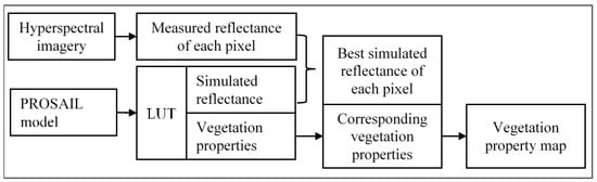 The PROSAIL model was downloaded from this link (http://teledetection.ipgp.jussieu.fr/prosail/, accessed in June 2017, version 5B) and was operated in Matlab []. This original PROSAIL was found to suffer when simulating the spectra of heterogeneous canopies [,], likely because the leaf-level PROSPECT model cannot sufficiently simulate spectra of senescent leaves []. Therefore, a modified PROSPECT that is capable of tackling this problem was developed and applied in this study to generate a modified PROSAIL []. Parameters in PROSAIL include leaf chlorophyll content, leaf water content, leaf area index, solar and view geometry, and soil reflectance [,,]. Vegetation canopy reflectance was extracted from hyperspectral imagery. A lookup table approach (LUT) was applied as the inversion method to estimate vegetation properties from the canopy reflectance data [,]. A brief workflow of the inversion is shown in Figure 4. A LUT was defined using all possible values within a value range for each parameter in the PROSAIL model. This value range was determined with prior knowledge from the literature [,,]. For instance, the leaf chlorophyll content has a range of 0~100 µg/cm2 and the leaf water content (i.e., equivalent water thickness) has a range of 0~0.05 cm. Then, the model calculated all possible combinations of values from different parameters and simulated reflectance correspondingly. This method covers all types of leaves and canopy structures, thus generating a dataset including all possible reflectance. With the measured canopy reflectance from hyperspectral imagery, a global search was performed in the LUT to identify parameter combinations that yield the best fit between measured and forward-simulated vegetation spectra. At last, vegetation properties, i.e., optimal parameter combinations, including leaf chlorophyll content and LAI, were determined.