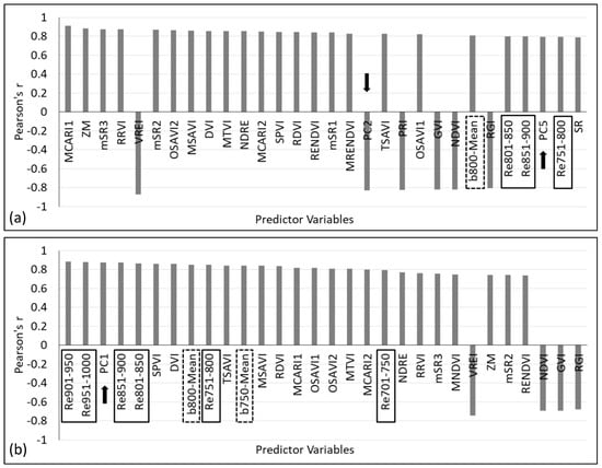 Top 30 strongest correlations between predictor variables and canopy chlorophyll contents. (a) For image acquired in June. (b) For image acquired in August. Reflectance variables are highlighted with solid rectangles, textural variables with dashed rectangles, and principal components (PCs) with arrows. Each reflectance labelled in the figure is a group of neighboring reflectance variables that are highly correlated with each other, such as the Re801–850 includes reflectance from 801 to 850 nm.