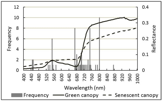 Frequency of wavelengths used in all the vegetation indices (listed in Table 1). The grey bars represent frequency of different wavelengths. The solid curve is a typical reflectance of green canopies and the dashed curve is of a senescent canopy (i.e., mixed green and senescent vegetation).