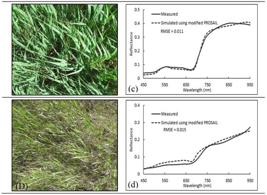 A modified PROSAIL model, which integrated a modified PROSPECT-5 model and SAIL model, was used for simulating vegetation spectra (e.g., leaf and canopy reflectance) and estimating vegetation properties (e.g., leaf chlorophyll content, LAI). The modified PROSPECT-5 model worked well for simulating reflectance of different types of leaves (e.g., green and senescent), achieving an average RMSE of 0.009 with a standard deviation of 0.004. Examples of leaf spectral simulations are shown in Figure 7a,b. The modified PROSAIL model also performed well for simulating reflectance of both green and mixed canopies, achieving an average RMSE of 0.029 with a standard deviation of 0.018. Examples of canopy spectral simulations are shown in Figure 7c,d. The effectiveness of PROSAIL for estimating vegetation properties are evaluated in the next sections.