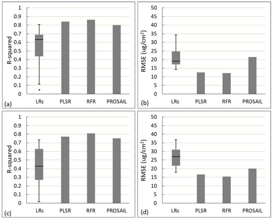 The PROSAIL also performed well, achieving an R2 of 0.80 and RMSE of 21.4 µg/cm2 for the June image and an R2 of 0.75 and RMSE of 20.1 µg/cm2 for the August image (Figure 8). Compared to the regression models, the PROSAIL performed similarly well as the best performing LR, although not as well as the PLSR and RFR (Figure 8). One essential advantage of PROSAIL is that it can be transferred to different sites in different seasons (e.g., June and August in this study), while regression models are mostly not transferable (i.e., require collecting new training data). In addition, PROSAIL can generate a set of vegetation biophysical and biochemical properties at the same time, such as leaf chlorophyll content, leaf water content, and LAI, which can provide a more solid understanding of vegetation growth condition and physiological status. While the regression models, including LR, PLSR, and RFR, can only retrieve one vegetation property (i.e., one dependent variable) at a time.