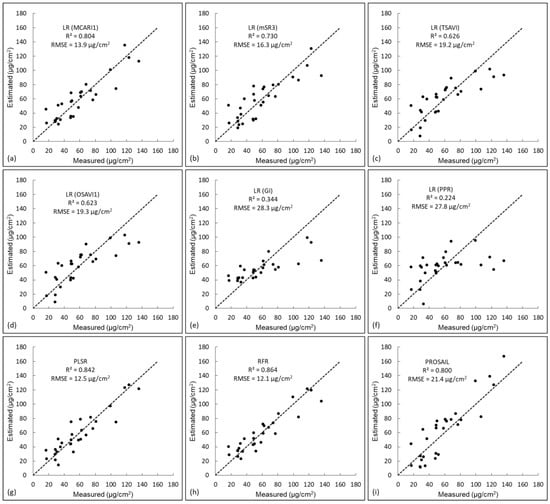 Scatter plots of measured canopy chlorophyll contents against estimated values from different models that were built for the June image are shown in Figure 9 as examples, aiming to further evaluate performance of different models (e.g., over- or under-estimation). For the top performing LRs (e.g., R2~0.75, RMSE~15 µg/cm2), such as the ones built with MCARI1 or mSR3 (Figure 9a,b), no clear over- or under-estimation is observed. For the LRs established with TSAVI or OSAVI1 (Figure 9c,d), which have medium accuracy values (e.g., R2 ~ 0.62, RMSE ~ 19 µg/cm2), under-estimation occurs for the measured chlorophyll higher than 100 µg/cm2. This is probably due to the saturation problem of TSAVI and OSAVI1. These two indices are built with NIR and red bands (Table 1) and thus may suffer from the spectral saturation when the canopy is dense. Involving the red-edge bands, such as the top performing MCARI1 and mSR3, can probably mitigate this problem. The LRs built with GI or PPR have poor accuracy values (e.g., R2 < 0.35, RMSE > 25 µg/cm2) and show clear over-estimation for measured chlorophyll lower than 70 µg/cm2 and under-estimation when over 70 µg/cm2 (Figure 9e,f). These two indices are generated with only visible bands, such as GI with green and red and PPR with green and blue. They cannot capture spectral variations in the NIR range that is sensitive to the canopy density and thus had poor performance. Therefore, when selecting VIs for building LRs, it is essential to select a variety of VIs that use bands in different spectral ranges (e.g., visible, red-edge, and NIR) and evaluate their performance. The PLSR and RFR used a wide range of VIs and thus did not suffer from over- or under-estimation (Figure 9g,h). The PROSAIL is a physically-based model and uses full spectrum information, and thus also did not experience obvious over- or under-estimation (Figure 9i).