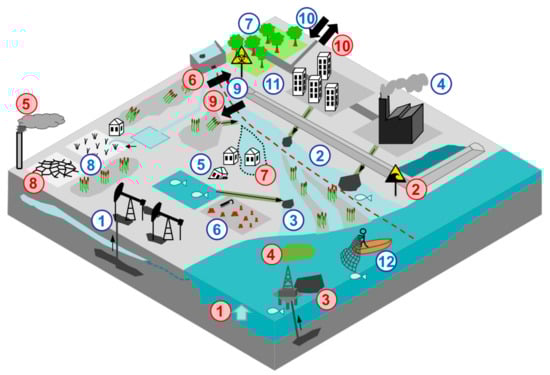 Major external (red) and internal (blue) threats generic to most settled river delta areas. External: 1: sea level rise, 2: storm surges and tsunamis, 3: offshore oil spills, 4: allochthonous sea water pollution, 5: allochthonous air pollution, 6: upstream water diversion/related flood pulse changes/sediment retention/water pollution, 7: upstream related floods, 8: droughts, 9: hydrocracy interests, 10: in-migration, food security tele-connections, extensive tourism. Internal: 1: oils and gas spills and related pollution, 2: industry and urban related water and soil pollution, 3: agriculture- and aquaculture-related water and soil pollution, 4: autochthonous air pollution, 5: geologic/ compaction/ underground resource extraction related land subsidence, 6: coastal forest/wetland destruction, 7: plant disease outbreaks, 8: monoculture expansion, 9: hydrocracy interests, 10: out-migration of the delta population, 11: barriers and infrastructure development, 12: overfishing and wildlife collection.