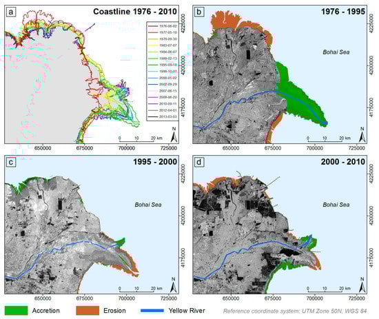 Coastline changes over the course of 34 years in the Yellow River Delta, based on Landsat MSS and Landsat TM satellite data (a), as well as shoreline accretion and erosion between 1976 and 2010 (b–d).