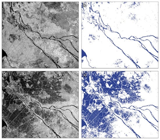 Stern [155] forecasts that due to the combined effect of rising sea levels and increasing population densities along the coast, hundreds of millions more people will likely be affected by flooding each year, increasing pressure for coastal protection, especially in large coastal cities. Furthermore, Stern [156] predicts an increasing number of people who will be permanently displaced due to sea level rise, heavier or unpredictable floods or other processes. The majority of deltas are on course to drown [8]. According to Syvitzki et al. [7], since the year 2000, about 80% of the 33 river deltas analyzed were exposed to severe flooding, with over 260,000 km2 being frequently submerged. Areas at future risk of flooding are expected to grow by 50% [7,8]. But not only floods originating from the ocean side (SLR, storm surges, etc.) are a threat to delta areas. Many deltas experience severe flooding due to rainy season flood pulse patterns of the main stem river, due to unexpected rainfall upstream or in the delta, or simply due to human-induced water diversion schemes. Deltas are thus located in a sandwiched position, with excess water looming from the ocean side as well as from upstream locations or processes within the delta. Geospatial information derived from satellite Earth observation can support the visualization of flood and inundation dynamics in deltas globally. This potential has been discussed in depth by Kuenzer et al. [12,22,156,157,158,159], as well as in the recent review study of Huang et al. [160].