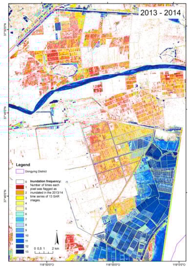 Inundation frequency patterns in the Yellow River Delta, as extracted from a time series of 13 TerraSAR-X StripMap data sets (2.5 m) for 2013/14. Inundation frequency is the number of times a given pixel was flagged as inundated in the time series. (Adapted with permission from Kuenzer et al. [22]).