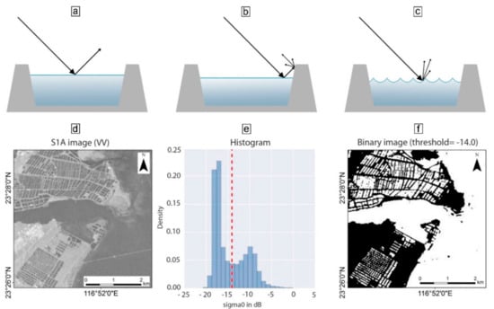 (Top) Examples of radar interaction with aquaculture ponds: (a) specular reflection (smooth water surface); (b) corner/embankment; and (c) diffuse reflection (rough water surface). (Bottom) S1A image (d); related histogram and classification threshold (e); and binary image of water and non-water after application of threshold (f). (Modified from Ottinger et al. [171]).