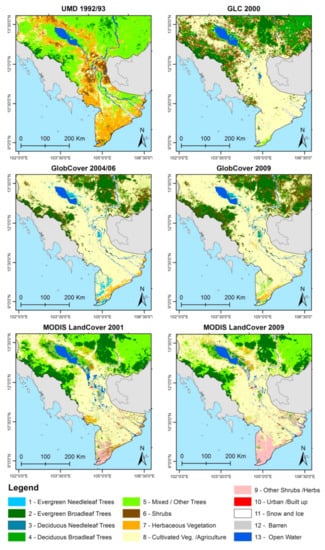 - Kuenzer, C.; Leinenkugel, P.; Vollmuth, M.; Dech, S. Comparing Global Land-Cover Products—Implications for Geoscience Applications: An Investigation for the Trans-Boundary Mekong Basin. Int. J. Remote Sens. 2014, 35, 2752–2779. [Google Scholar] [CrossRef]
