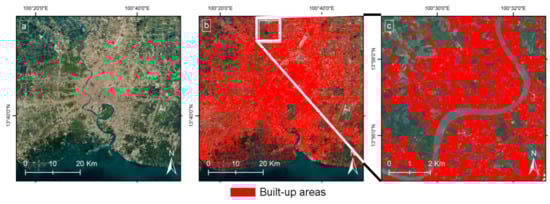 Urban surfaces (built-up area) in the Chao Pharya River Delta area in Bangkok, Thailand. Shown are a true color aerial image of the delta (a), built-up areas (red) for the same area (b) and a smaller excerpt (c), see (b) for location of bounding box) as mapped by the Global Urban Footprint for 2015 from TerraSAR-X data.
