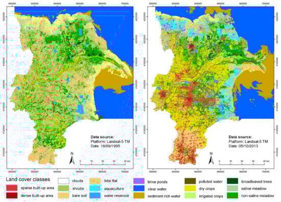 Results of a decision tree-based land cover, land use classification for the Yellow River Delta in China for the year 1995 (left) and for the year 2013 (right). (Adapted with permission from Ottinger et al. [186]).