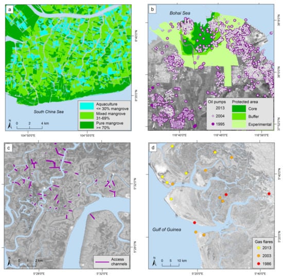 Examples for monitoring compliance. (a): mangrove percentage on a farmer’s land in Ca Mau Province, Mekong Delta, (b): spread of oil pumps in the northern Yellow River Delta Nature Reserve between 1995 and 2013, (c): spread of oil industry related access channels in the Niger Delta, (d): development of gas flares in part of the Niger Delta.