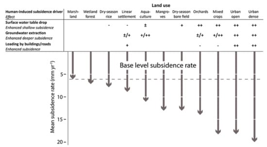 Mean InSAR-based subsidence rates for important land-use classes in the Vietnamese Mekong River Delta for the 2006–2010 analysis period and breakdown of mechanisms causing the subsidence provided in Minderhoud et al. [218]. (Adapted with permission from Minderhoud et al. [218]).