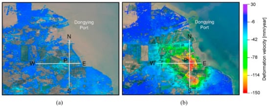 Vertical subsidence velocity map near Dongying Port in the Yellow River Delta, China, for the periods of (a) 2007–2010 and (b) 2015–2018. (Adapted with permission from [219]).
