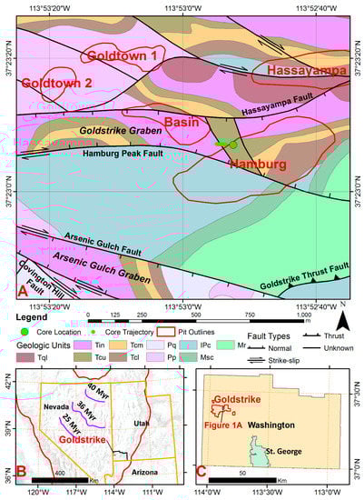 (A) Geologic map of the Hamburg pit and nearby area; (B) location of the Goldstrike district and Washington County, Utah in the basin and range setting of eastern Great Basin (red); and (C) location of the Goldstrike district (red) in Washington County, Utah. The core location is shown with a large green circle in (A), and the map view trajectory of the retrieved core samples is shown with small green dots, pit outlines and names are shown in red. Mapped geologic units in (A) are: Tql = Leach Canyon Formation; Tin = Isom Formation and Wah Wah Springs Formation; Tcu = Claron Formation upper unit; Tcm = Claron Formation middle unit; Tcl = Claron Formation lower unit; Pq = Queantoweap Sandstone; Pp = Pakoon Formation; IPc = Callville Limestone; Msc = Scotty Wash Quartzite and Chainman Shale; Mr = Redwall Limestone. Original geologic map in (A) retrieved from Rowley et al. [19], the original scale of the map is 1:24,000. The magenta lines in (B) represent the mid-Tertiary magmatic fronts that swept the Great Basin from northeast to southwest (from Muntean et al. [2]), the ages of the magmatic fronts are also labeled. The black rectangle in (C) shows the extent of the map area in (A) within the Goldstrike District.