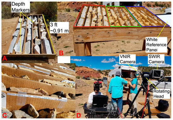 (A) A core box with five 3-ft-long columns containing core samples, with depth markers separating core sections; (B) each hyperspectral scan covers three core boxes, a white reference panel is included for calibration; (C) metallurgy and geochemical results are labeled for each core section; and (D) field setup of hyperspectral cameras mounted on a pan and tilt rotating head (FLIR Systems, Wilsonville, USA) to scan core samples.