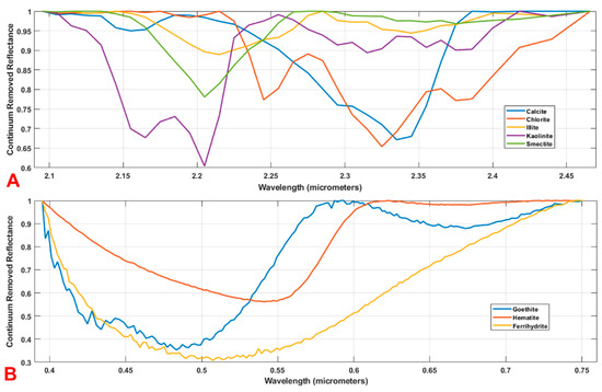 (A) Continuum removed spectra of common carbonate and phyllosilicate minerals in sedimentary rocks, and (B) continuum removed spectra of common ferric iron oxide and hydroxides, data from Clark et al. [30].