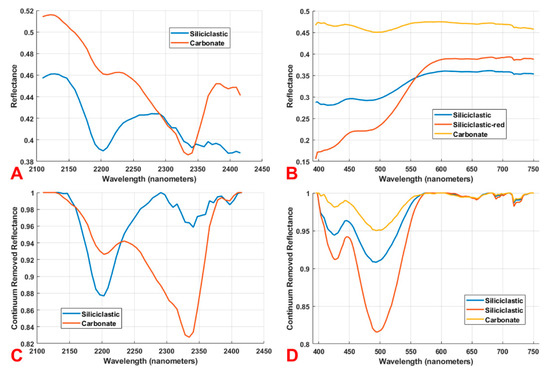 (A) Mean spectral reflectance curves of scanned core samples in the SWIR spectrum; (B) mean spectral reflectance curves of scanned core samples in the visible and near-infrared (VNIR) spectrum; (C) mean continuum removed reflectance curves of scanned core samples in the SWIR spectrum; and (D) mean continuum removed reflectance curves of scanned core samples in the VNIR spectrum. Some siliciclastic rocks showed strong red-yellow colors with abundant ferric iron, these rocks were plotted separately in the VNIR spectra (B,D).