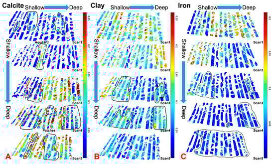 It is shown that the upper sections were mostly deficient in calcite and the lower sections were rich in calcite (Figure 7A). Compared with the stratigraphic column and the drilling records, these sections were most probably the siliciclastic sediments of the basal Claron Formation on the top and the underlying Callville Limestone on the bottom. The unconformity separating them was probably near the third core column from the left side of Scan3 (Figure 7A).