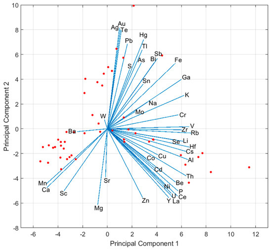 Bi-plot of principal components from the geochemical analyses. Blue vectors show loadings (correlation coefficients) of element concentrations, and red dots show sample scores (linear combinations of eigenvectors). The lengths of element vectors were magnified 30 times to increase legibility.