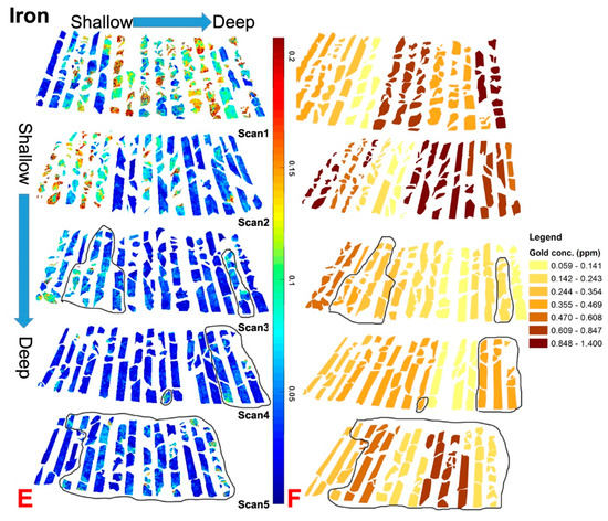 Much of the scanned Callville Limestone has undergone various degrees of decarbonatization. Patches of high calcite content surrounded by areas of lower calcite content can be seen below the unconformity in Scan3, are prevalent in Scan4, and in some columns in Scan5. Some sections have gone through strong decarbonatization removing all the calcite. Decarbonatization may reflect more active gold mineralization, as the gold concentrations are relatively higher in these sections (Figure 9B). Some of the scanned Callville Limestone has also undergone various degrees of argillization. Samples of medium clay contents can be seen in Figure 9C, with argillization corresponding to more active gold mineralization and relatively higher gold concentrations (Figure 9D). Some samples in Callville Limestone showed higher ferric iron (Figure 9E), which might correlate with pyrite oxidation after mineralization with higher gold concentrations (Figure 9F).
