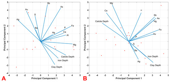 (A) Bi-plot of the principal components from average absorption depths and selected elements in the siliciclastic rocks of the basal Claron Formation; and (B) bi-plot of principal components from average absorption depths and selected elements in the carbonate rocks of the Callville Limestone as well as the carbonate section in the basal Claron Formation. Vectors show loadings of elements and absorption depths, and dots show sample scores. The lengths of element vectors were magnified ten times to increase legibility.