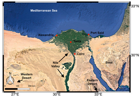 The area of study geographically covers the Nile Delta, which is bounded by the Mediterranean Sea to the north, the Western Desert to the west, the Eastern Desert and Sinai to the east, and the Nile Valley to the south. The area is approximately 35,000 km2 and includes major urbanized cities such as Cairo, Alexandria, and Tanta. However, the majority is rural areas and agricultural land. The Nile Delta is a typical arcuate delta with Cairo City in the apex. It accommodates about 55% of the population and it secures the food for the population via agriculture (Figure 1).