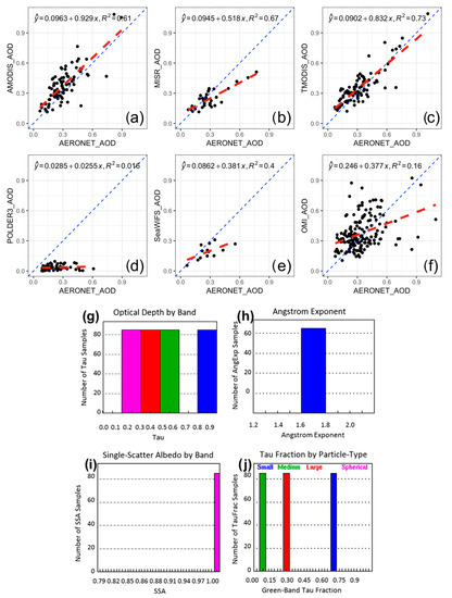 Scatter plots of Cairo AErosol RObotic NETwork (AERONET) aerosol optical depth (AOD) observations as to AOD data from (a) Aqua MODIS, (b) MISR, (c) Terra MODIS, (d) POLDER3, (e) SeaWiFS, and (f) OMI in EMA and Cairo University stations. Aerosol histograms with no cloud contamination where color indicates band for (g) optical depth, (h) Ångström exponent, (i) single scattering albedo (SSA), and (j) Tau (AOD) fraction by particle over Egypt on 14 September 2008.