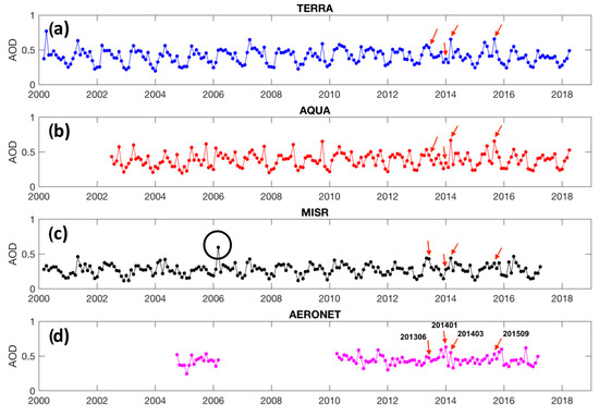 Time series plot of AOD in Cairo during 2000 to 2018 for (a) Terra MODIS, (b) Aqua MODIS, (c) MISR, and (d) AERONET, respectively. Red arrows point to the high AOD anomalies indicated during June 2013 (summer), January 2014 (winter), March 2014 (spring), and September 2015 (fall).