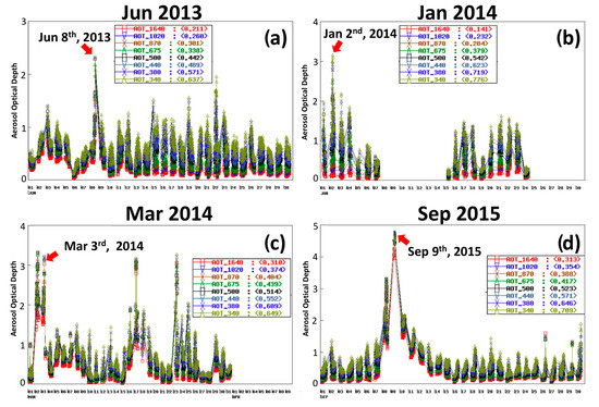 Time series of AERONET monthly AOD during (a) June 2013, (b) January 2014, (c) March 2014, and (d) September 2015. Red arrows point to the high AOD anomalies events during each month: 8 June, 2 January, 3 March, and 9 September, respectively.