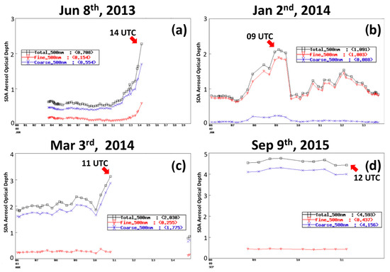 Time series of AERONET Daily 500-nm AOD spectral deconvolution algorithm (SDA) retrievals during (a) 8 June 2013, (b) 2 January 2014, (c) 3 March 2014, and (d) 9 September 2015, respectively. Black/blue/red lines represent total/coarse/find aerosols, respectively.