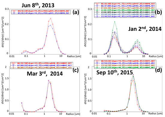 Size distributions of aerosols during (a) 8 June 2013 (b) 2 January 2014, (c) 3 March 2014, and (d) 10 September 2015, respectively. Lines in different colors represent different observations during the day.