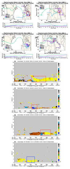 Back-trajectories analysis during (a) 8 June 2013, (b) 2 January 2014, (c) 3 March 2014, and (d) 9 September 2015, respectively, as well as the Cloud-Aerosol Lidar and Infrared Pathfinder Satellite Observation (CALIPSO) aerosol subtype classifications for the same scenes (a,b,d) with their associated highlighted region of interest: (e) red box: the Greater Delta and Mediterranean region (at 00:06 to 00:19 UTC 6 June 2013); (f) red box: the Greater Delta and Mediterranean region (at 00:05 to 00:19 UTC 2 January 2014); (g) red box: the Mesopotamia region (at 23:24 to 23:37 UTC 3 March 2014) and (h) blue box: the Egypt’s Western Desert region (at 11:14 to 11:27 UTC 9 September 2015). The missing CALIPSO aerosol subtype analysis for 3 March 2014 (c) due to data unavailability.
