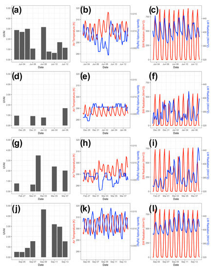 The Ultra Violet Aerosol Index (UVAI) (a,d,g,j), air temperature, and specific humidity (b,e,h,k), shortwave (SW) and longwave (LW) radiation (c,f,i,l) values recorded before and after five days for each aerosol episode: 8 June 2013 (a–c); 2 January 2014 (d–f); 3 March 2014 (g–i); and 9 September 2015 (j–l).