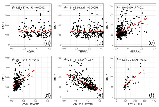 The relationship between the daily average of PM10 and multiple products: (a) MODIS Aqua AOD; (b) MODIS Terra AOD; (c) Modern-Era Retrospective analysis for Research and Applications version 2 (MERRA-2) AOD; (d) AERONET AOD at 1020 nm; (e) AERONET Ångström exponent (AE) at 340 nm/440 nm; (f) predicted PM10 values from the Random Decision Forest model output.