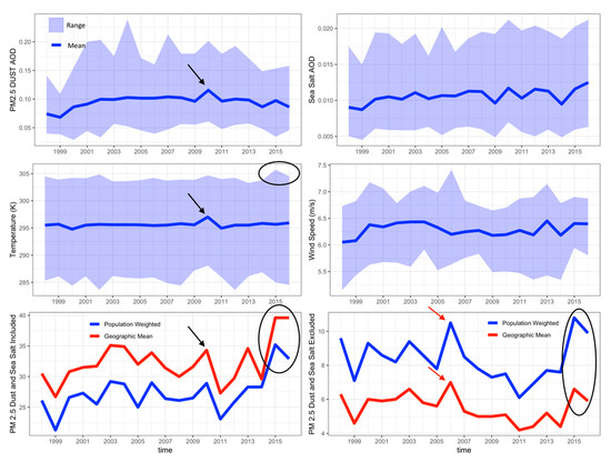 Figure 10 shows the average annual PM2.5 for all of Egypt using GWR datasets to compare with monthly MERRA-2 datasets (min, max, and mean values) of PM2.5 dust AOD and sea salt AOD, as well as surface air temperature and wind speed during the period from the year 1998 to 2016. Since the majority of Egypt is covered with depopulated desert regions, the population weighted PM2.5 is apparently lower than the geographic mean PM2.5 for all the types of PM2.5 components. However, with dust and sea salt excluded, the population-weighted PM2.5 is higher than that of the geographic mean due to the PM2.5 particles mainly coming from civilization, such as industrial and transport emissions and burnt agriculture waste. The black arrows point to the 2010 PM2.5 including dust and sea salt, showing the impact of anomalous high temperature, particularly during cool months, on the rising of PM2.5 dust aerosols. The black circles suggest the relationship between both record-breaking hot months and emergently increased PM2.5, regardless of the dust and sea salt components. The red arrows show the severely high PM2.5 in 2006, which is explained by the excessively numerous fire events during the “black cloud” season [2,3].