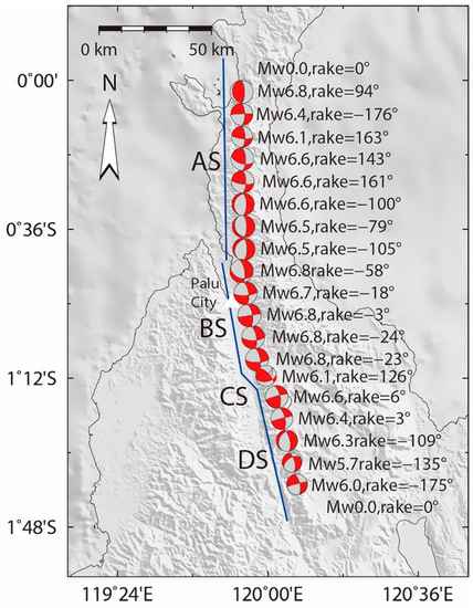 - Wei, S.; Feng, G.; Zeng, H.; Martin, S.; Shi, Q.; Muzli, M.; Wang, T.; Lindsey, E.; Triyono, R.; Hubbard, J.; et al. The 2018 Mw 7.5 Palu Earthquake, a Gradually Accelerating Super-Shear Rupture Stopped by Stress Shadows in a Complex Fault System; AGU Fall Meeting Abstracts: Washington, DC, USA, 2018. [Google Scholar]