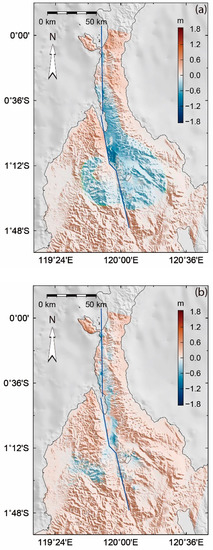 - Walpersdorf, A.; Vigny, C.; Subarya, C.; Manurung, P. Monitoring of the Palu-Koro Fault (Sulawesi) by GPS. Geophys. Res. Lett. 1998, 25, 2313–2316. [Google Scholar] [CrossRef]