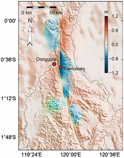 - Song, X.; Zhang, Y.; Shan, X.; Liu, Y.; Gong, W.; Qu, C. Geodetic Observations of the 2018 Mw 7.5 Sulawesi Earthquake and Its Implications for the Kinematics of the Palu Fault. Geophys. Res. Lett. 2019, 46, 4212–4220. [Google Scholar] [CrossRef]