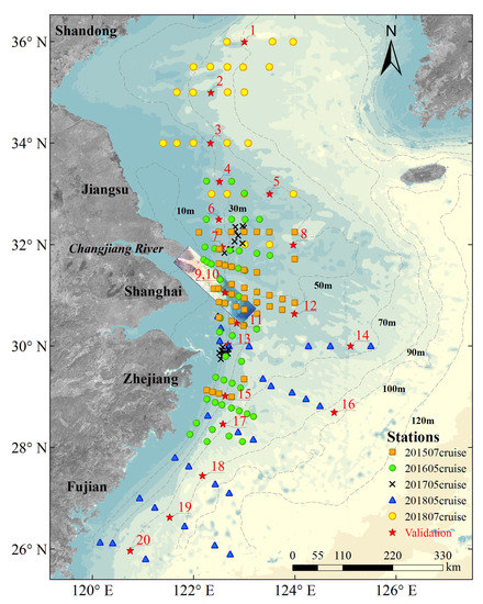 Sampling locations of 183 stations during the five field campaigns from 2015 to 2018, including 163 stations used for the NNTL construction and 20 numbered stations used for validation, and overlaid with the true color Hyperspectral Imager for the Coastal Ocean (HICO) image used in this study (Section 2.3). The color-coded bathymetry data (GEBCO_2014 Grid, version 20150318) was obtained from GEBCO (http://www.gebco.net/). Depth contours of 10, 30, 50, 70, 90, 100 and 120 m are sketched by gray dashed lines.